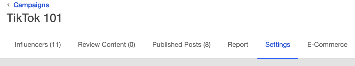 - Settings: This is where you can edit your campaign settings and information and add more keywords and hashtags that will determine which posts will automatically be pulled into the campaign. You can also set total campaign goals to reach, such as a certain number of views or engagements, and what types of posts the influencers need to publish in order to fulfill the requirements set by you or the brand.