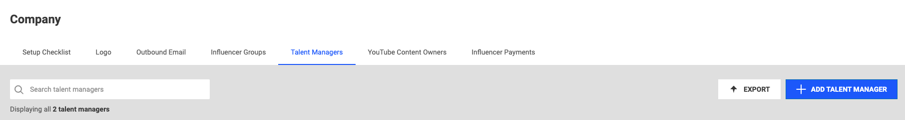 To add talent manager accounts to your company, click on Settings in the left-hand sidebar in Influence,, then the Company tab > Talent Managers tab. Click the + Add Talent Manager button in the upper-right corner to add a new talent manager.