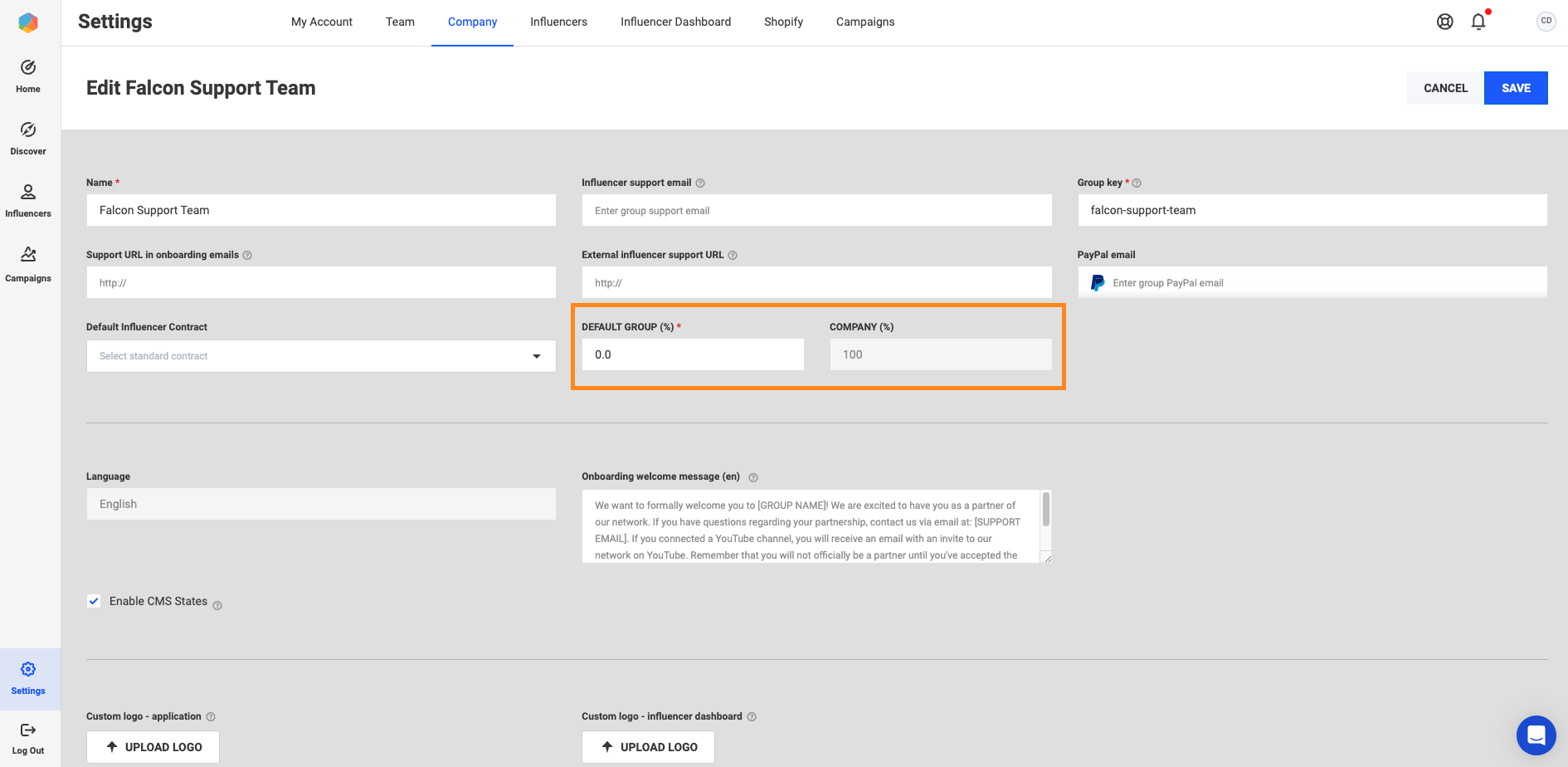 The default group share is the cut that the group receives from the company's share of the influencer revenue, unless a custom group share has been specified in the influencer's application.