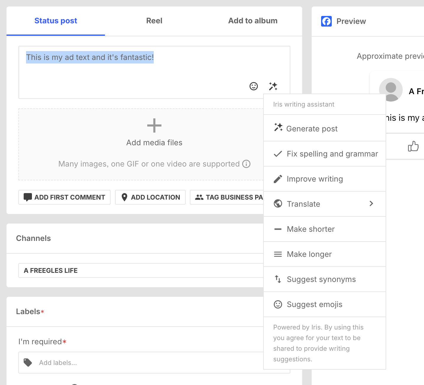 Enter some starter text in the text box for your post. The more detailed your text, the more detailed Iris’s generated posts will be. You can choose your text language to be one of the supported languages in Social Media Management.