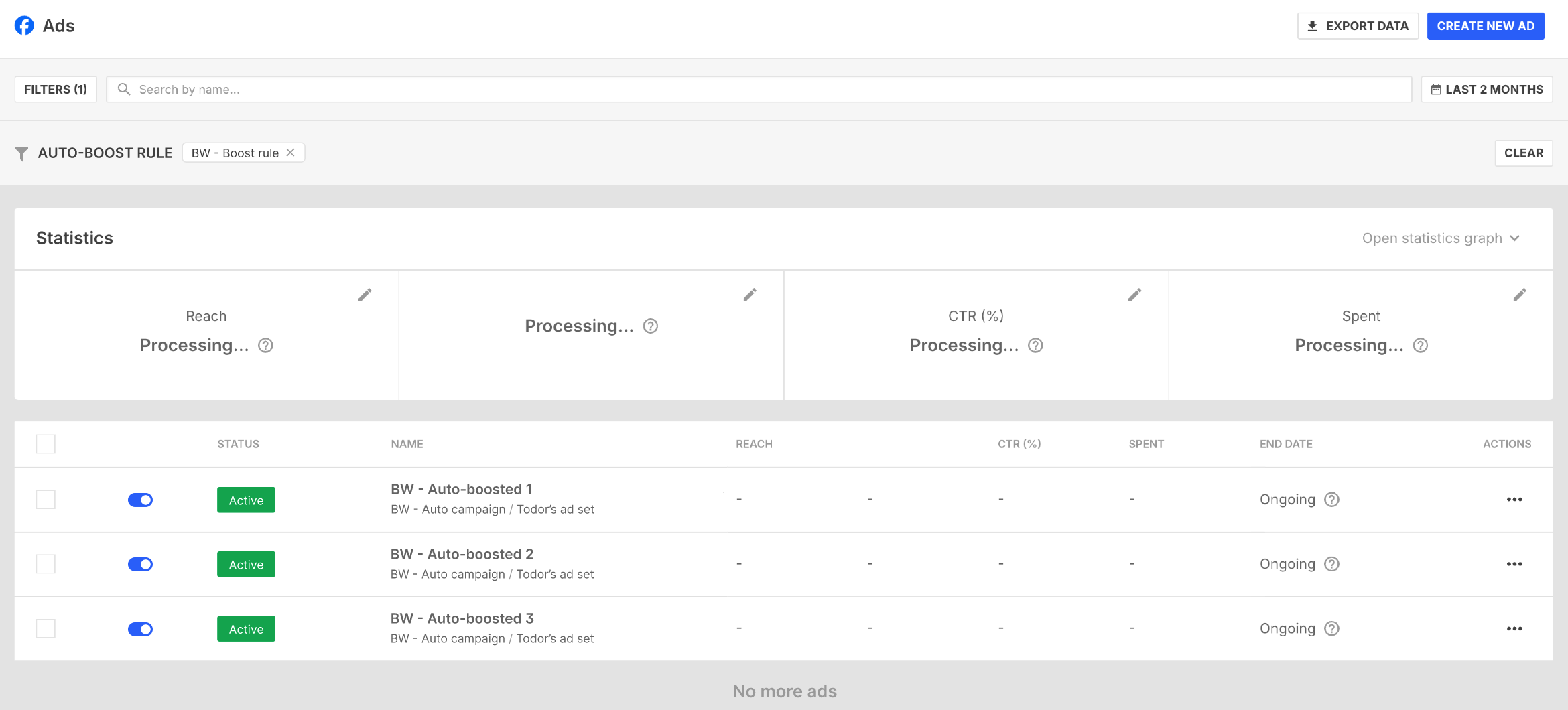 From the Auto-boost menu in Advertise, select the Filter icon to see the statistics of all ads boosted by the rule.