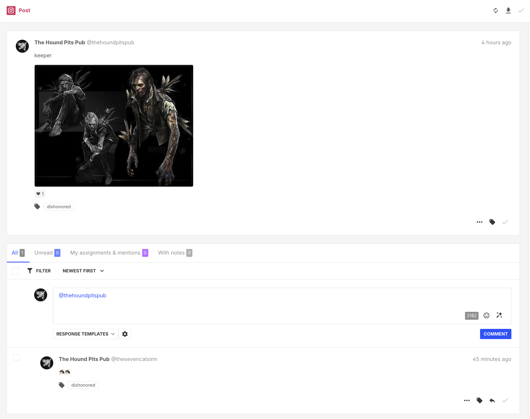 - The total number of labeled Conversations. This metric only counts labels on DM threads and top-level posts, not their individual comments, replies, or messages. For example, in the screenshot below, the post's label will count towards total Conversations, but the labeled comment under the post will not.